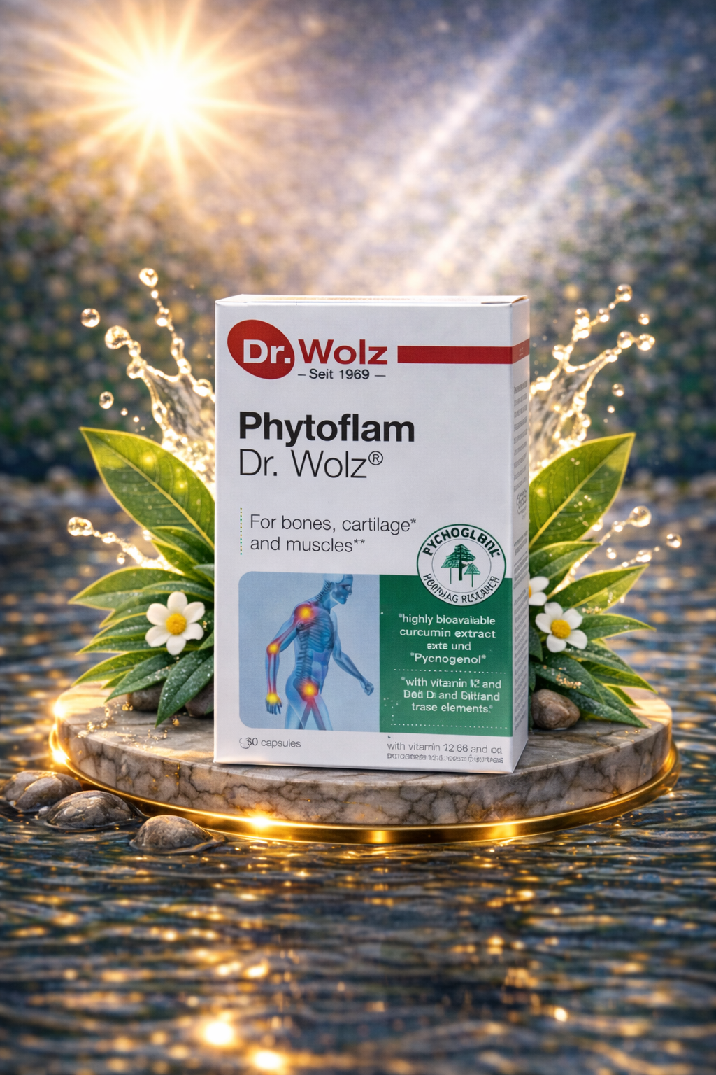 Phytoflam Dr. Wolz® is an innovative complex for bones, cartilage1 and muscles2. The preparation consists of highly bioavailable curcumin, boswellia, French maritime pine bark (Pycnogenol®) and vitamin K2, D3 and vitamin C from rose hip extract.